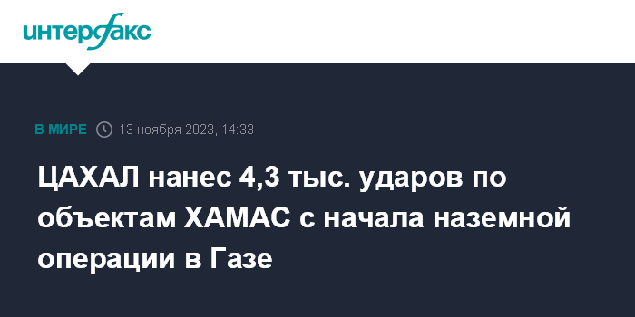 Москва. 13 ноября. INTERFAX.RU - Армия обороны Израиля (ЦАХАЛ) нанесла по меньшей мере 4,3 тыс. ударов по военным объектам ХАМАС в секторе Газа с начала наземной операции в анклаве около двух недель назад, говорится в сообщении ЦАХАЛ в телеграм-канале.