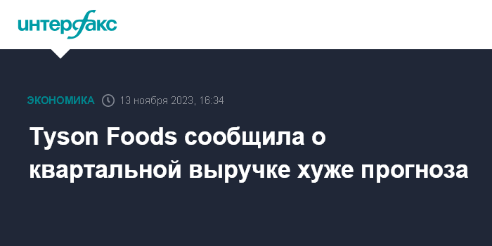 Москва. 13 ноября. INTERFAX.RU - Американский производитель продуктов питания Tyson Foods в четвертом квартале 2023 финансового года (июль-сентябрь) получила выручку ниже прогноза и дала слабый прогноз на начавшийся финансовый год.