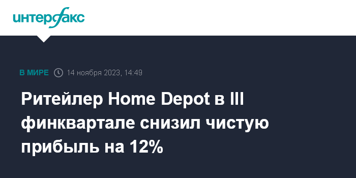 Москва. 14 ноября. INTERFAX.RU - Американская Home Depot Inc., оператор крупнейшей в США сети магазинов товаров для дома и ремонта, в третьем квартале 2023 финансового года снизила чистую прибыль на 12,2% при сокращении выручки на 3%.