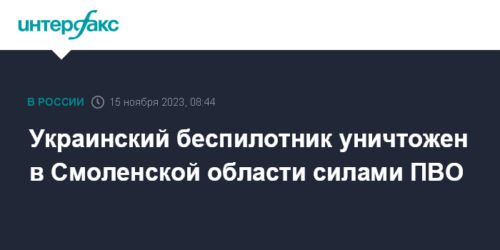 Москва. 15 ноября. INTERFAX.RU - Минобороны России сообщило об уничтожении украинского беспилотника над территорией Смоленской области в среду около 7:30.