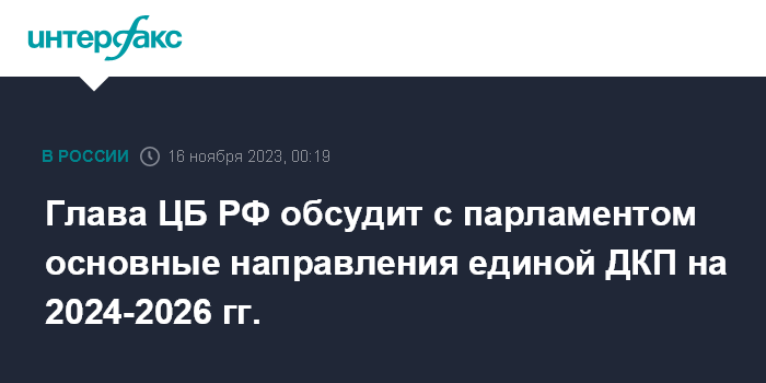 Глава ЦБ РФ обсудит с парламентом основные направления единой ДКП на 2024-2026 гг.