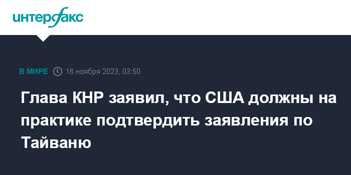 Москва. 16 ноября. INTERFAX.RU - В ходе переговоров с президентом США Джо Байденом в Сан-Франциско председатель КНР Си Цзиньпин заявил, что Соединенные Штаты должны практическими действиями подтвердить заявления по тайваньскому вопросу.