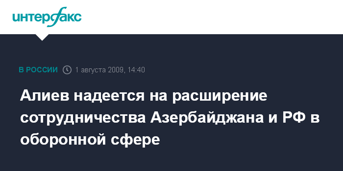 Баку. 1 августа. INTERFAX.RU - Президент Азербайджана Ильхам Алиев на встрече с министром обороны России Анатолием Сердюковым в субботу в Баку выразил надежду на расширение сотрудничества двух стран в сфере обороны и военно-технического сотрудничества, сообщили "Интерфакс-Азербайджан" в администрации президента.
