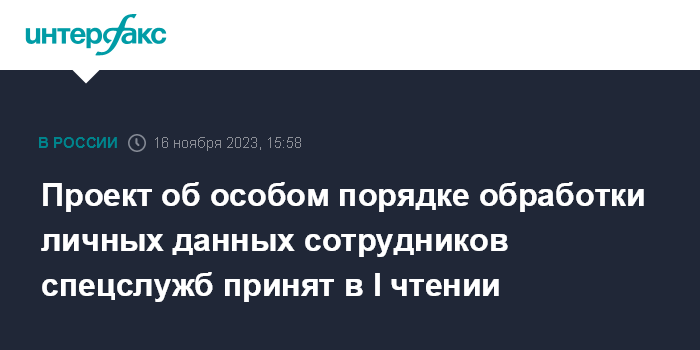 Москва. 16 ноября. INTERFAX.RU - Госдума в четверг приняла в первом чтении проект закона об особом порядке обработки персональных данных сотрудников спецслужб.