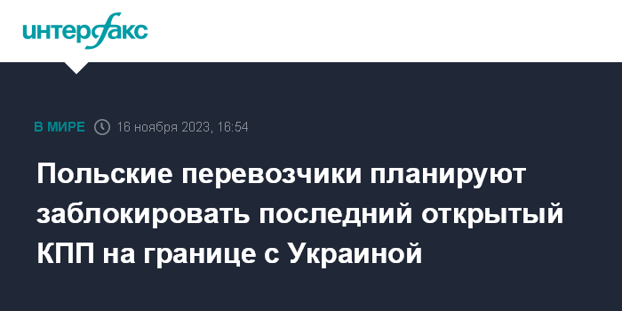 Москва. 16 ноября. INTERFAX.RU - Протесты польских дальнобойщиков и присоединившихся к ним сельхозпроизводителей на границе с Украиной со следующей недели могут затронуть последний пока полностью функционирующий КПП "Медыка" (Подкарпатское воеводство), сообщают польские СМИ.
