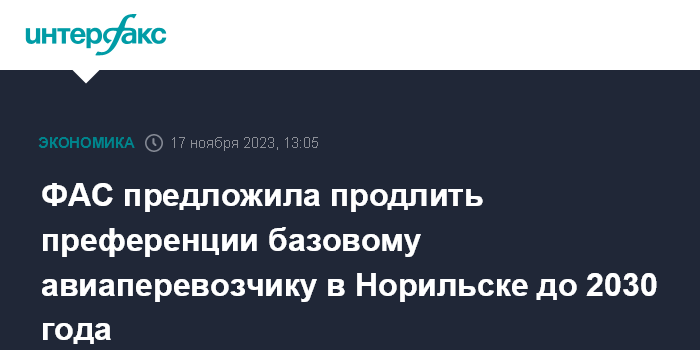 ФАС предлагает продлить действие преференций для базового перевозчика аэропорта Норильска до 31 декабря 2029 года. По мнению антимонопольного органа, это должно сохранить и повысить транспортную доступность Норильского промышленного района, в котором воздушный транспорт является безальтернативным для населения.