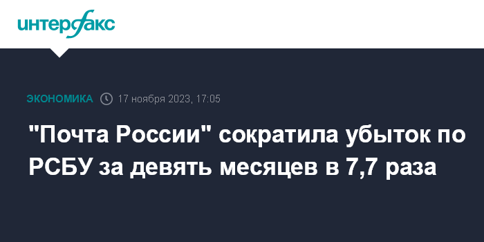 Москва. 17 ноября. INTERFAX.RU - Чистый убыток АО "Почта России" за девять месяцев по РСБУ составил 2,58 млрд рублей, что в 7,7 раза меньше, чем за аналогичный период 2022 года (19,78 млрд рублей), говорится в сообщении компании.