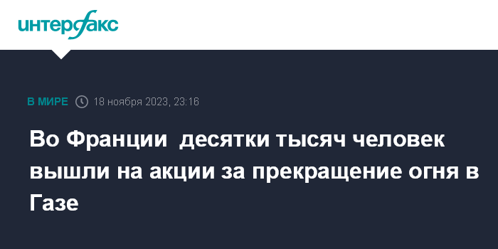 Москва. 18 ноября. INTERFAX.RU - В Париже и десятках французских городов в субботу прошли манифестации солидарности с палестинским народом, участники требовали прекращения огня в секторе Газа.