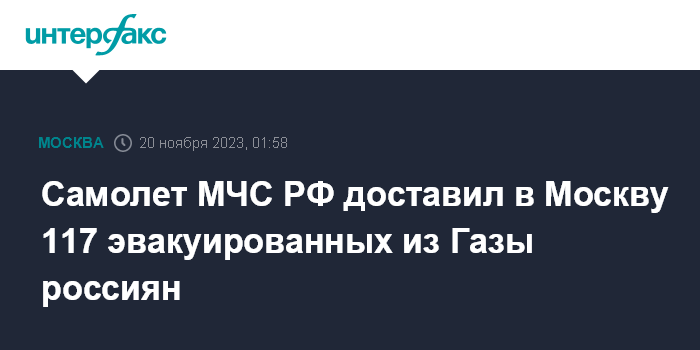 Москва. 20 ноября. INTERFAX.RU - Самолет Ил-76 МЧС России доставил в Москву 117 россиян, эвакуированных из Газы, сообщает телеграм-канал ведомства.
