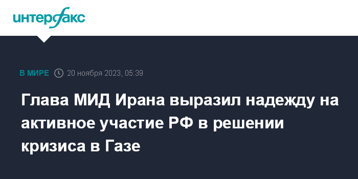 Москва. 20 ноября. INTERFAX.RU - Глава МИД Ирана Хосейн Амир Абдоллахиан выразил надежду на активное участие РФ в поисках решения кризиса в секторе Газа, сообщает агентство "Мехр".