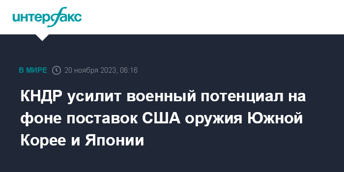 Москва. 20 ноября. INTERFAX.RU - КНДР заявила в понедельник, что укрепит свой потенциал "военного сдерживания" в связи с запланированными Вашингтоном продажами оружия Южной Корее и Японии.