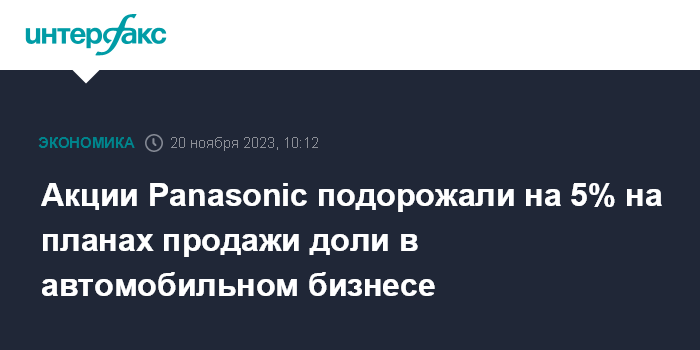 Москва. 20 ноября. INTERFAX.RU - Цена бумаг Panasonic Holdings Corp. зафиксировала активный рост по итогам второй сессии подряд после подписания соглашения о намерении продать долю в дочернем предприятии, разрабатывающем решения для автомобильного бизнеса, инвесткомпании Apollo Global Management.