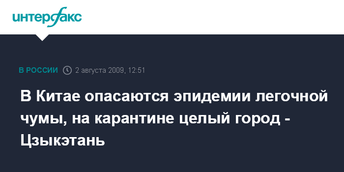 Лондон. 2 августа. INTERFAX.RU - Тысячи человек посажены на карантин в городе Цзыкэтань на северо-востоке КНР после того, как один из жителей города скончался от легочной чумы.