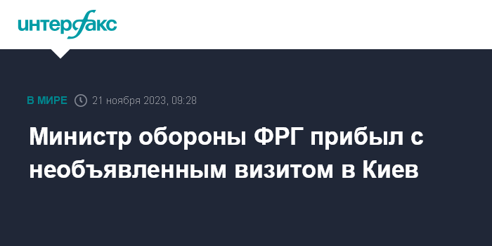 Москва. 21 ноября. INTERFAX.RU - Глава Минобороны Германии Борис Писториус во вторник начал визит на Украину, о котором предварительно не сообщалось, передает телеканал ZDF.