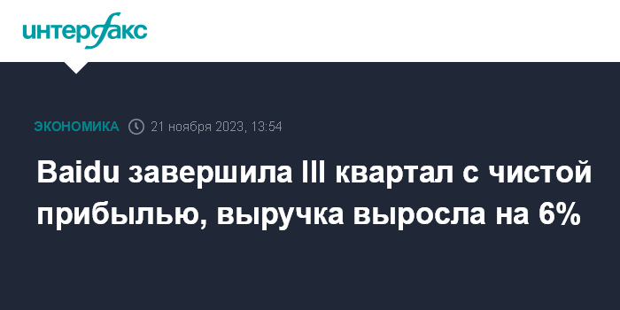 Москва. 21 ноября. INTERFAX.RU - Китайский интернет-гигант Baidu Inc. завершил третий квартал с чистой прибылью, при этом скорректированный показатель превзошел ожидания рынка, а выручка их не оправдала.