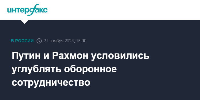 Москва. 21 ноября. INTERFAX.RU - Россия и Таджикистан будут укреплять сотрудничество в сфере обороны и безопасности в борьбе с наркоугрозами, а также в военно-технической сфере, заявил президент РФ Владимир Путин.