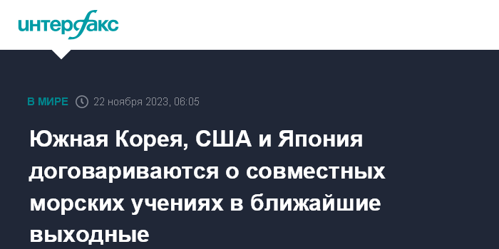 Москва. 22 ноября. INTERFAX.RU - Южная Корея ведет переговоры с США и Японией о проведении совместных морских учений вблизи Корейского полуострова в ответ на произведенный КНДР запуск военного спутника, сообщает "Ренхап" со ссылкой на правительственные источники.