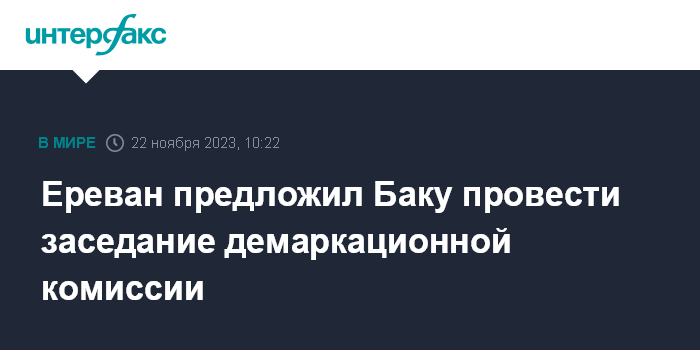 Москва. 22 ноября. INTERFAX.RU - Армения предложила Азербайджану провести заседание демаркационной комиссии на государственной границе между двумя странами, сообщил МИД Армении.