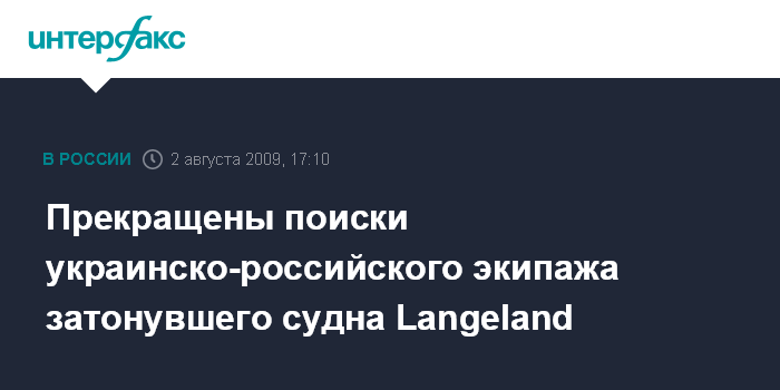 В Минтранссвязи напомнили, что 31 июня 2009 года в 07.00 по киевскому времени шведскими спасательными службами был получен сигнал бедствия с аварийно-спасательного буя сухогрузного судна "Langeland" (флаг Норвегии). По информации спасательных служб, судно затонуло у берегов Швеции (острова Костер). В состав экипажа входили шесть человек, среди которых четверо, в том числе капитан судна, граждане Российской Федерации и двое - граждане Украины. Судно, перевозившее из Швеции в Норвегию строительный камень, попало в жесткий шторм силой до 9 баллов.