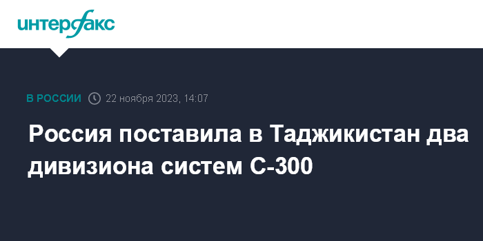Москва. 22 ноября. INTERFAX.RU - Россия в рамках создания общей системы противовоздушной обороны стран Организации Договора о коллективной безопасности (ОДКБ) поставила в Таджикистан два дивизиона систем С-300, правительство РФ до конца года должно завершить все необходимые процедуры, связанные с развертыванием системы ПВО в Таджикистане, сообщил президент РФ Владимир Путин.