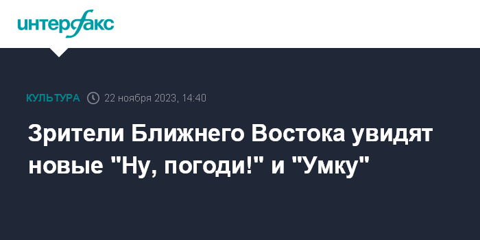 Москва. 22 ноября. INTERFAX.RU - Проекты киностудии "Союзмультфильм" появятся в онлайн-кинотеатре стран Ближнего Востока. Новые проекты, среди которых "Ну, погоди!" и "Умка", смогут увидеть жители из ОАЭ, Саудовской Аравии, Египта и других стран.