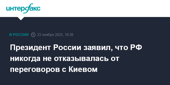 Москва. 22 ноября. INTERFAX.RU - Президент РФ Владимир Путин заявил, что Россия не отказывалась от мирных переговоров с Украиной.