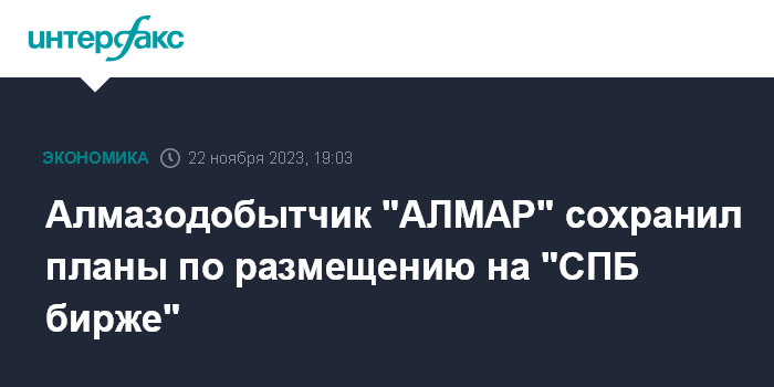 Москва. 22 ноября. INTERFAX.RU - Юниорная компания "АЛМАР - алмазы Арктики", владеющая лицензиями на освоение двух месторождений алмазов в арктической зоне Якутии, сохраняет планы по размещению на "СПБ бирже", несмотря на изменение ситуации вокруг этой торговой площадки, которая в начале ноября попала в SDN list.