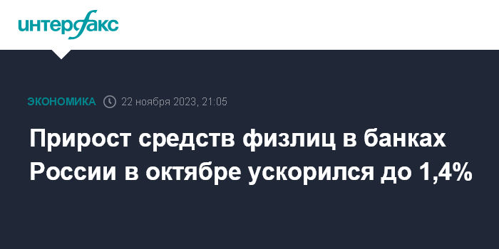 Прирост средств населения в октябре ускорился до 1,4% с 1,0% в сентябре.