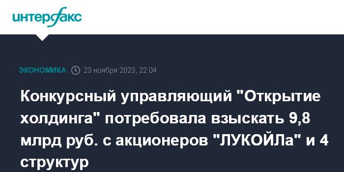 Москва. 23 ноября. INTERFAX.RU - Конкурсный управляющий "Открытие холдинга" Мария Булатова подала заявление о взыскании солидарно 9,75 млрд рублей убытков с акционеров "ЛУКОЙЛа" Вагита Алекперова и Леонида Федуна, а также четырех компаний, свидетельствует сообщение на Федресурсе.