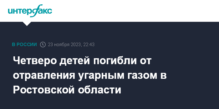Москва. 23 ноября. INTERFAX.RU - Отравление угарным газом стало причиной гибели четверых детей в хуторе Шахтенки в Ростовской области, сообщает МЧС РФ.