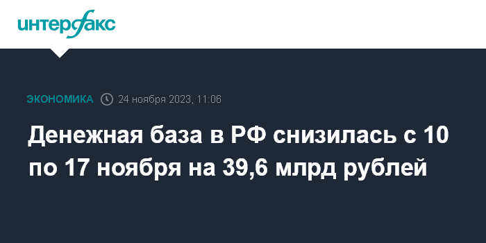 На 10 ноября денежная база в России равнялась 18 427,9 млрд рублей. Таким образом, за период она снизилась на 0,21%, или на 39,6 млрд рублей.