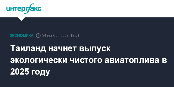 Москва. 24 ноября. INTERFAX.RU - Первый завод в Таиланде по производству экологически чистого авиационного топлива (SAF) из отработанного растительного масла начнет работать в начале 2025 года, пишет Bangkok Post.