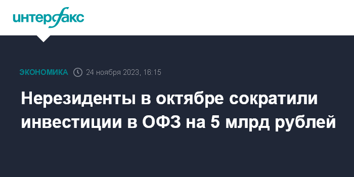 Москва. 24 ноября. INTERFAX.RU - Объем инвестиций нерезидентов в ОФЗ в октябре 2023 года уменьшился на 5 млрд рублей, или на 0,3%, до 1,500 трлн рублей, сообщается на сайте ЦБ РФ.