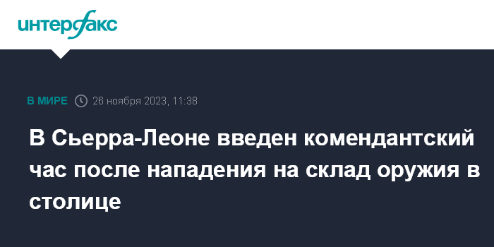 Москва. 26 ноября. INTERFAX.RU - Группа неизвестных совершила нападение на склад оружия в столице Сьерра-Леоне Фритауне, в стране введен комендантский час, сообщает министерство информации.