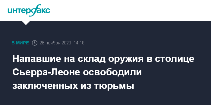 Москва. 26 ноября. INTERFAX.RU - Группа неизвестных, совершившая в воскресенье нападение на склад оружия в столице Сьерра-Леоне Фритауне, затем атаковала одну из столичных тюрем и освободила заключенных, сообщаю британские СМИ.