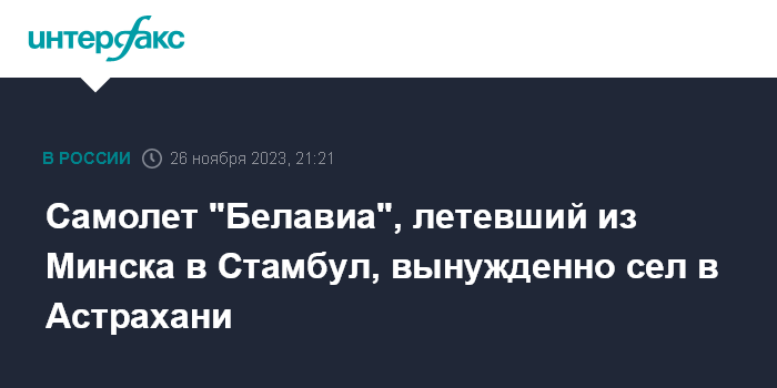 Москва. 26 ноября. INTERFAX.RU - Самолет белорусского авиаперевозчика "Белавиа", выполнявший рейс Минск-Стамбул, совершил вынужденную посадку в Астрахани.