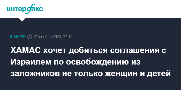 Москва. 27 ноября. INTERFAX.RU - Палестинское движение ХАМАС стремится достичь договоренностей с Израилем по освобождению заложников, среди которых будут не только женщины и дети, сообщают ближневосточные СМИ.