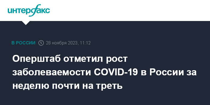 Москва. 28 ноября. INTERFAX.RU - Показатель заболеваемости коронавирусом в России за неделю с 20 по 26 ноября увеличился по сравнению с предыдущей неделей на 32,8%, сообщили в оперативном штабе по борьбе с коронавирусной инфекцией.