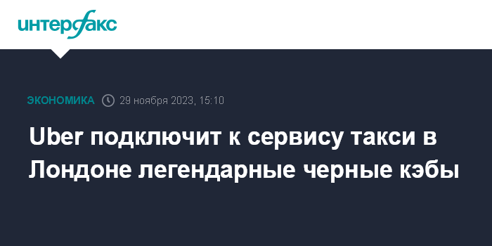 Москва. 29 ноября. INTERFAX.RU - Американская Uber Technologies, предоставляющая услуги заказа такси и доставки еды, в начале 2024 года запустит в Лондоне сервис поездок на легендарных черных кэбах (такси), сообщает сайт компании.