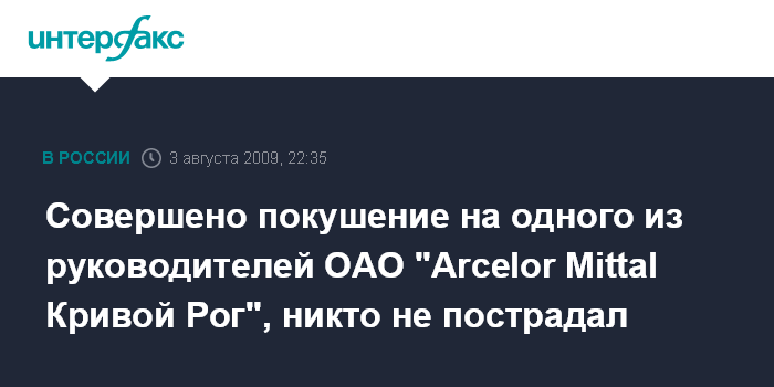 Это уже второй случай покушения на руководителей ОАО "Arcelor Mittal Кривой Рог". Как сообщалось, 3 июля был избит директор по общим вопросам ОАО Александр Зозуля. В результате нападения троих неизвестных и избиения битами А.Зозуля получил телесные повреждения средней тяжести и был госпитализирован.