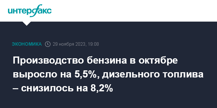 Производство бензина в октябре выросло на 5,5%, дизельного топлива – снизилось на 8,2%