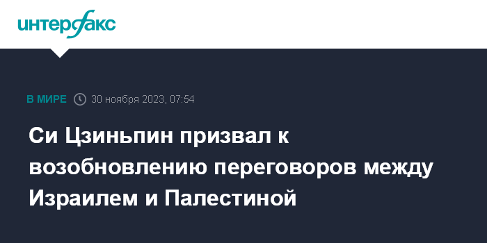 Москва. 30 ноября. INTERFAX.RU - Председатель КНР Си Цзиньпин заявил, что нынешняя ситуация в зоне палестино-израильского конфликта требует от СБ ООН эффективного выполнения обязанностей и усилий для содействия прекращению огня в секторе Газа, а также скорейшего возобновления палестино-израильских мирных переговоров, сообщил МИД КНР.