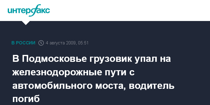 Москва. 4 августа. ИНТЕРФАКС-МОСКВА - На 174 км Большого кольца Московской железной дороги с автомобильного моста упал грузовой автомобиль, сообщил "Интерфаксу" во вторник руководитель службы по связям с общественностью Московской железной дороги (МЖД) Владимир Мягков.