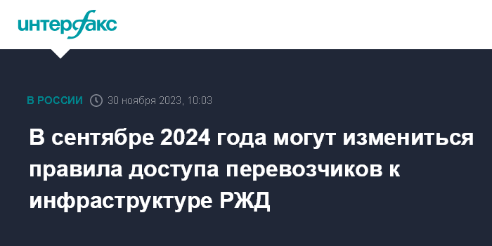 Москва. 30 ноября. INTERFAX.RU - Обновленная редакция правил недискриминационного доступа (ПНД) перевозчиков к инфраструктуре железнодорожного транспорта общего пользования может вступить в силу в сентябре 2024 года, сообщили в аппарате первого вице-премьера Андрея Белоусова.