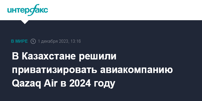 "Передача в конкурентную среду авиакомпании Qazaq Air запланирована на 2024 год", - говорится в сообщении.