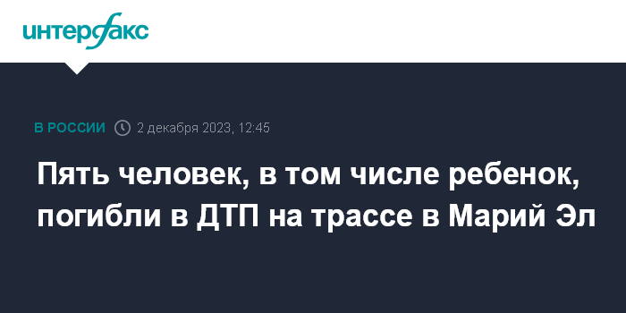 Москва. 2 декабря. INTERFAX.RU - Пять человек, в том числе ребенок, погибли в автомобильной аварии на трассе в Медведевском районе Марий Эл, сообщает телеграм-канал регионального управления ГИБДД.