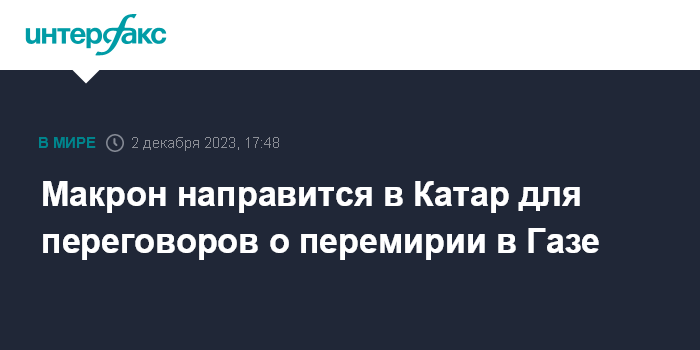Москва. 2 декабря. INTERFAX.RU - Президент Франции Эммануэль Макрон заявил в субботу, что направится в Катар, чтобы принять там участие в переговорах о новом перемирии в секторе Газа.