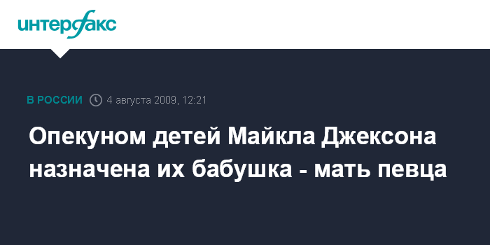 Москва. 4 августа. INTERFAX.RU - Мать покойного американского певца Майкла Джексона Кэтрин Джексон официально признана опекуном троих детей певца, сообщают американские СМИ. Решение о назначении официальным опекуном детей скончавшегося певца 79-летней Кэтрин Джексон было принято высшим судом Лос-Анджелеса, отмечается в сообщении.