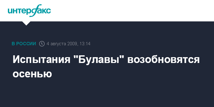 Москва. 4 августа. INTERFAX.RU - Очередной испытательный пуск стратегической ракеты морского базирования "Булава" состоится не ранее сентября, сообщили "Интерфаксу" во вторник в ракетно-космической отрасли.