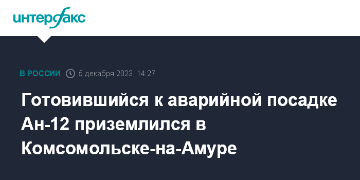 Москва. 5 декабря. INTERFAX.RU - Самолет Ан-12, который готовился к аварийной посадке на аэродроме Хурба (Комсомольск-на-Амуре, Хабаровский край) благополучно приземлился в 19:35 по местному времени (12:35 по Москве) во вторник, сообщила Дальневосточная транспортная прокуратура в телеграм-канале.
